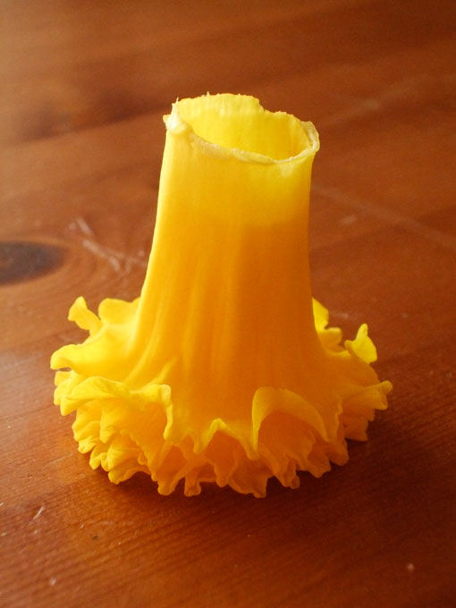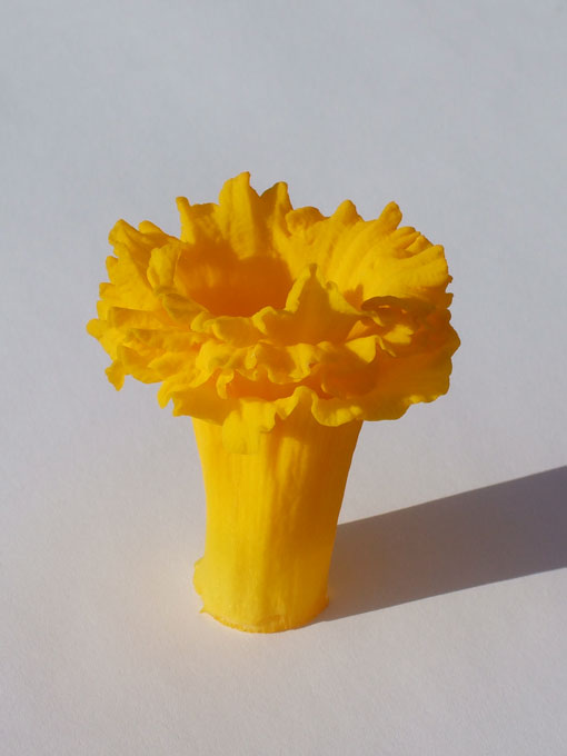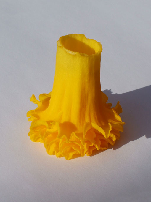 I think this stack contains about four daffodil trumpets. Facing down, it reminds me of those fantastic, swirly-hemmed gowns that I often see professional ballroom dancers wearing (behold a bright, daffodil-yellow one on this page!). The other way up, a bodice with a gloriously-frothy, off-the-shoulder neckline in chiffon ruffles or feather trim. Sheer decadence.