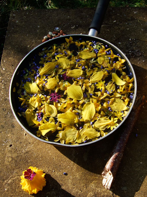 Still, the sun came through to encourage us into the garden this weekend. Do your eyes deceive you? Why, no! They do not: pictured above is indeed a pan full of ‘The Famous Chattelay‘! This time, the dainty dish has been prepared with forsythia, daffodil and vinca petals. Delicious! (Probably. Don’t eat this.)